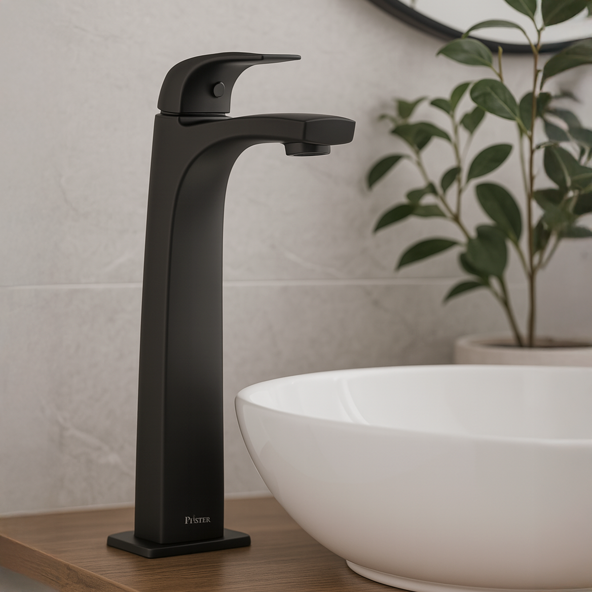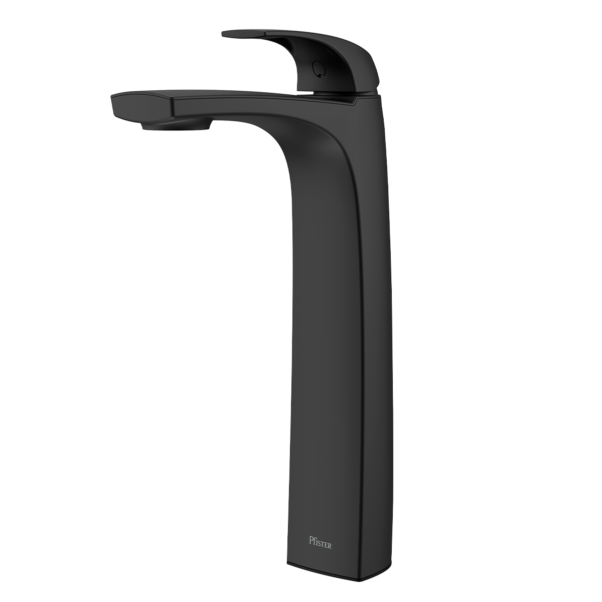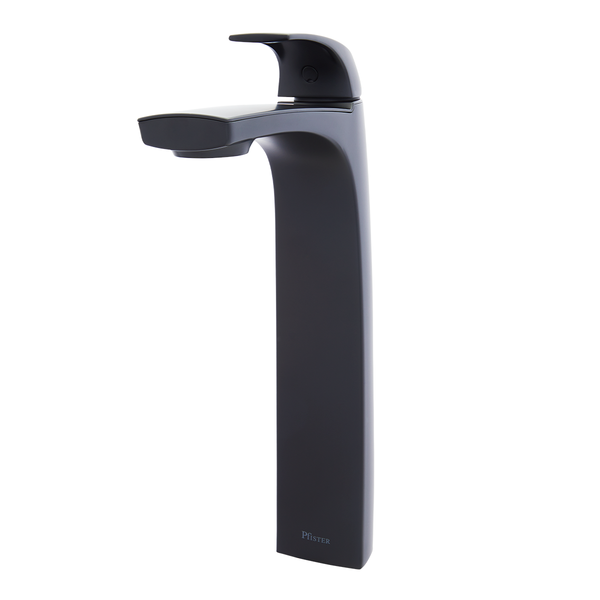 Grifería mezcladora monomando de diseño alto y moderno en acabado negro mate, ideal para baños contemporáneos. Controla fácilmente la temperatura del agua con una sola manija. Fabricada por Pfister, combina estilo, funcionalidad y durabilidad.