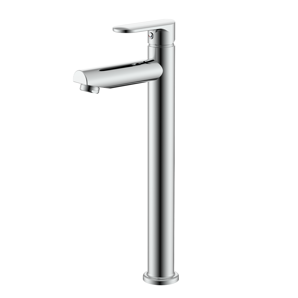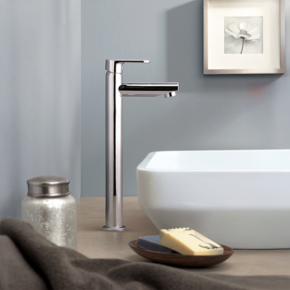 Grifería mezcladora de diseño elegante y cuerpo alto, ideal para lavamanos tipo bowl. Acabado en cromo pulido que resiste manchas y aporta un toque moderno al baño. Compatible con agua caliente y fría.