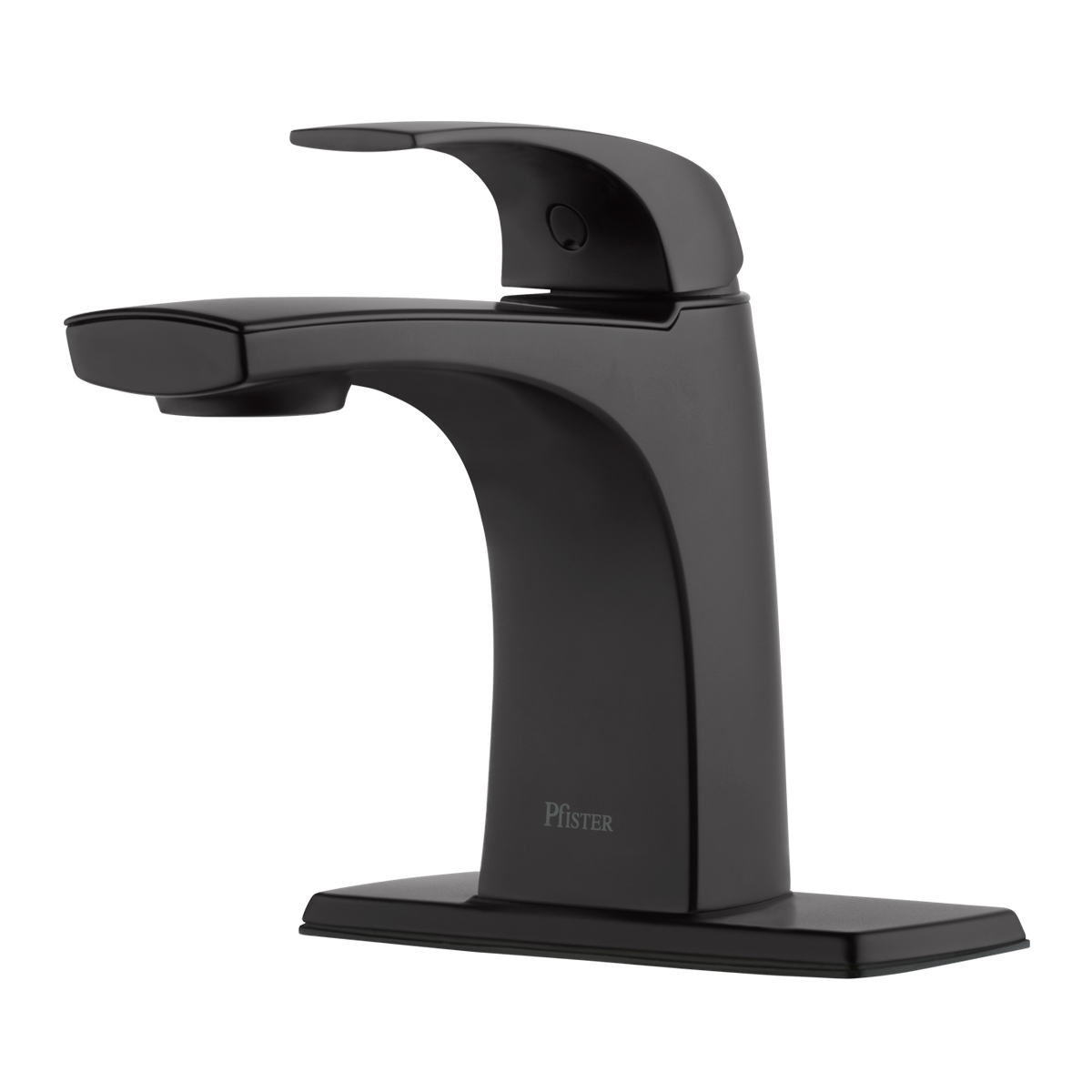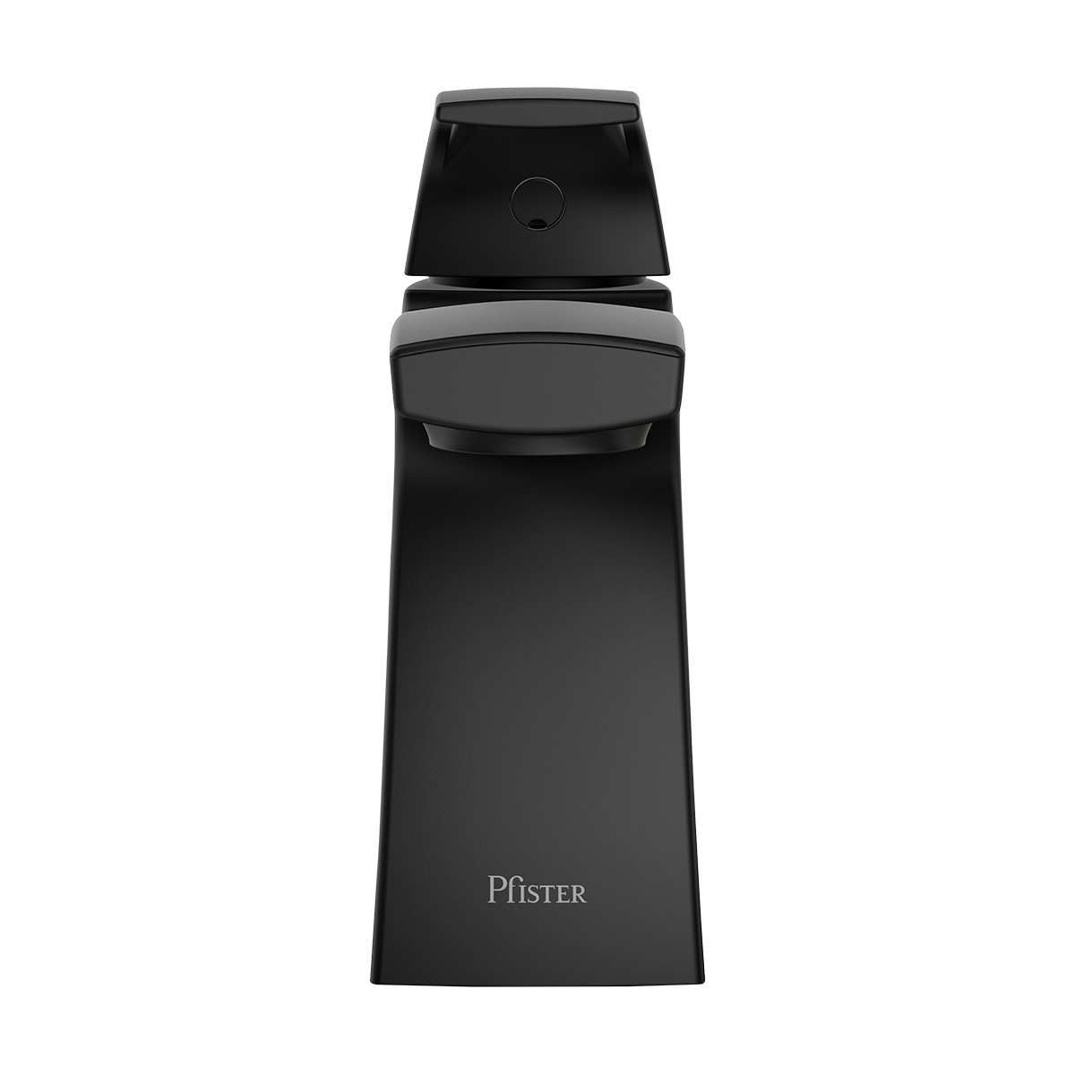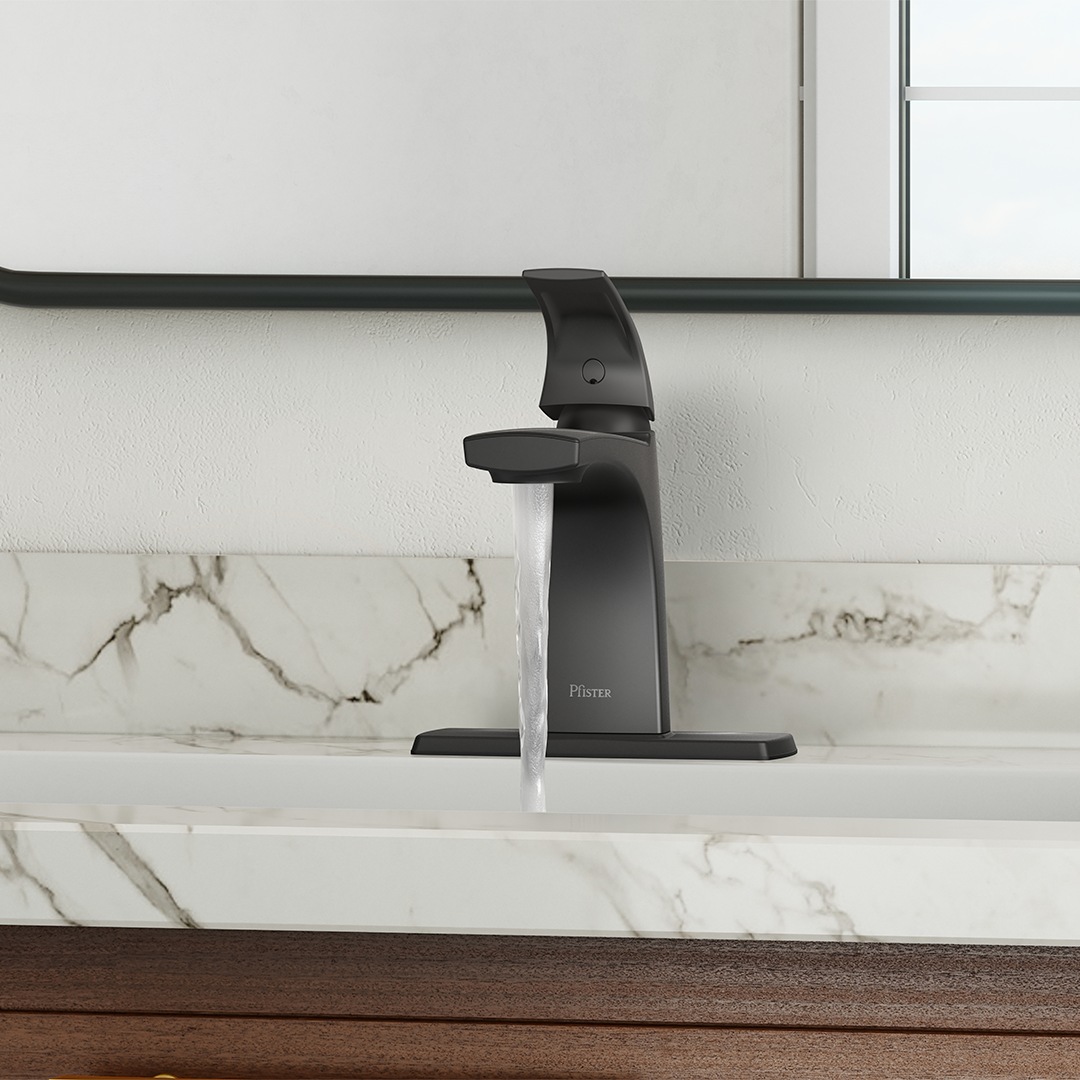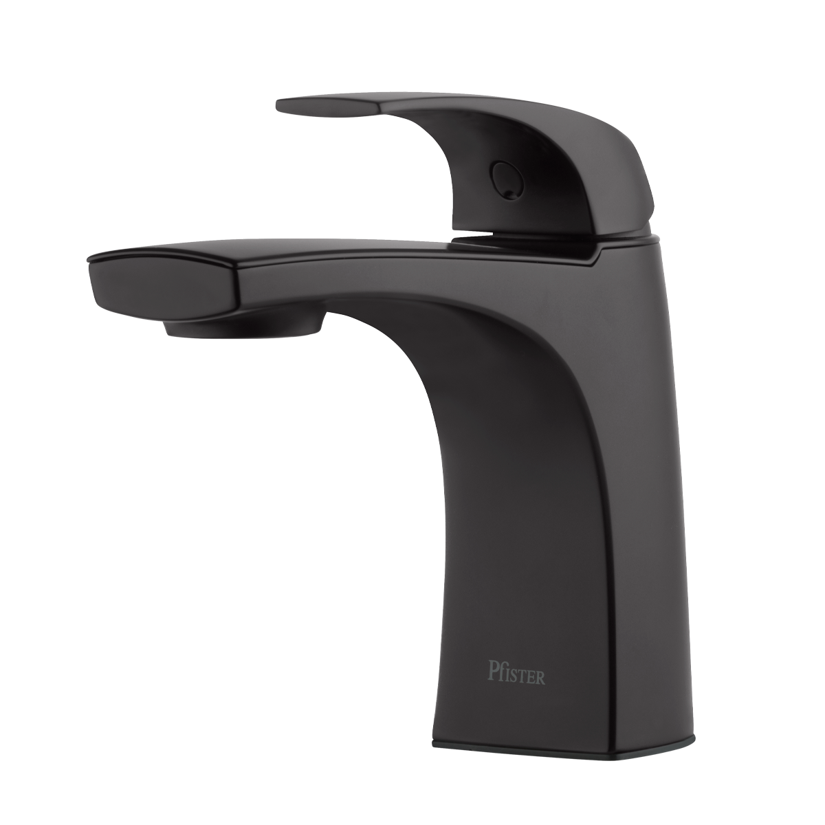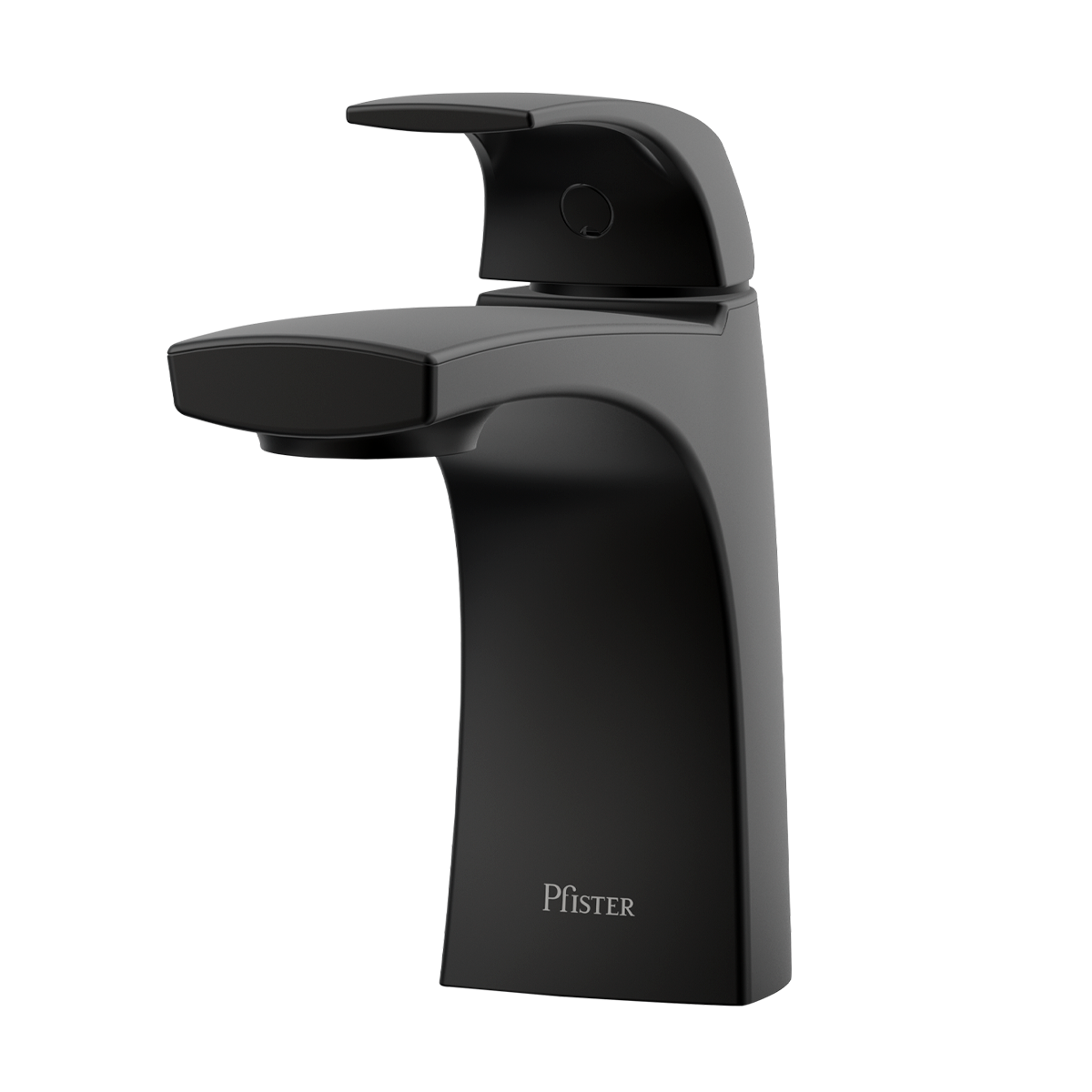 Grifería mezcladora monomando de diseño moderno en acabado negro mate, ideal para baños contemporáneos. Controla fácilmente la temperatura del agua con una sola manija. Fabricada por Pfister, combina estilo, funcionalidad y durabilidad.