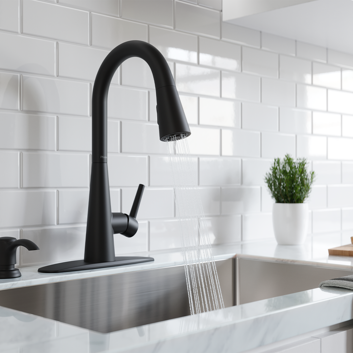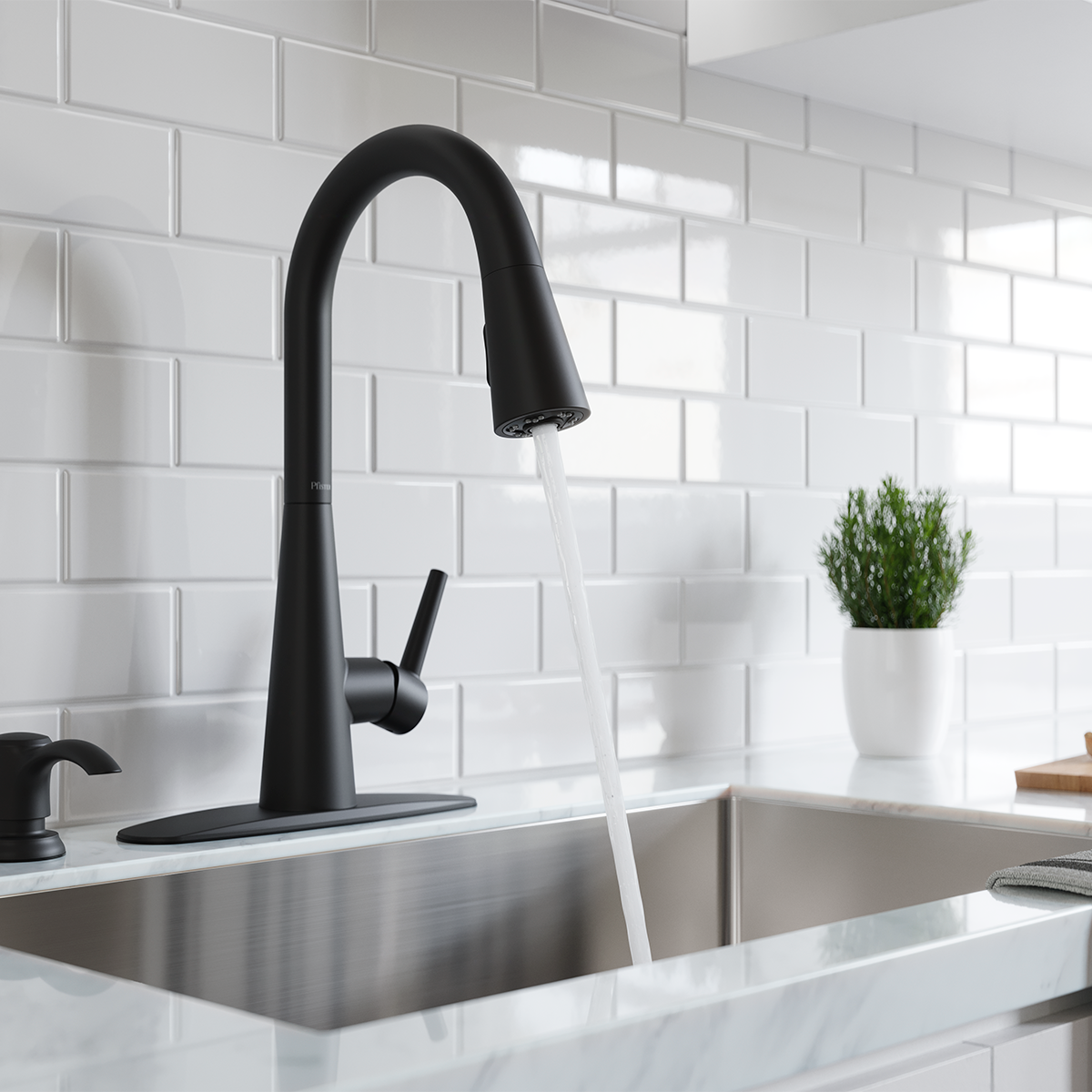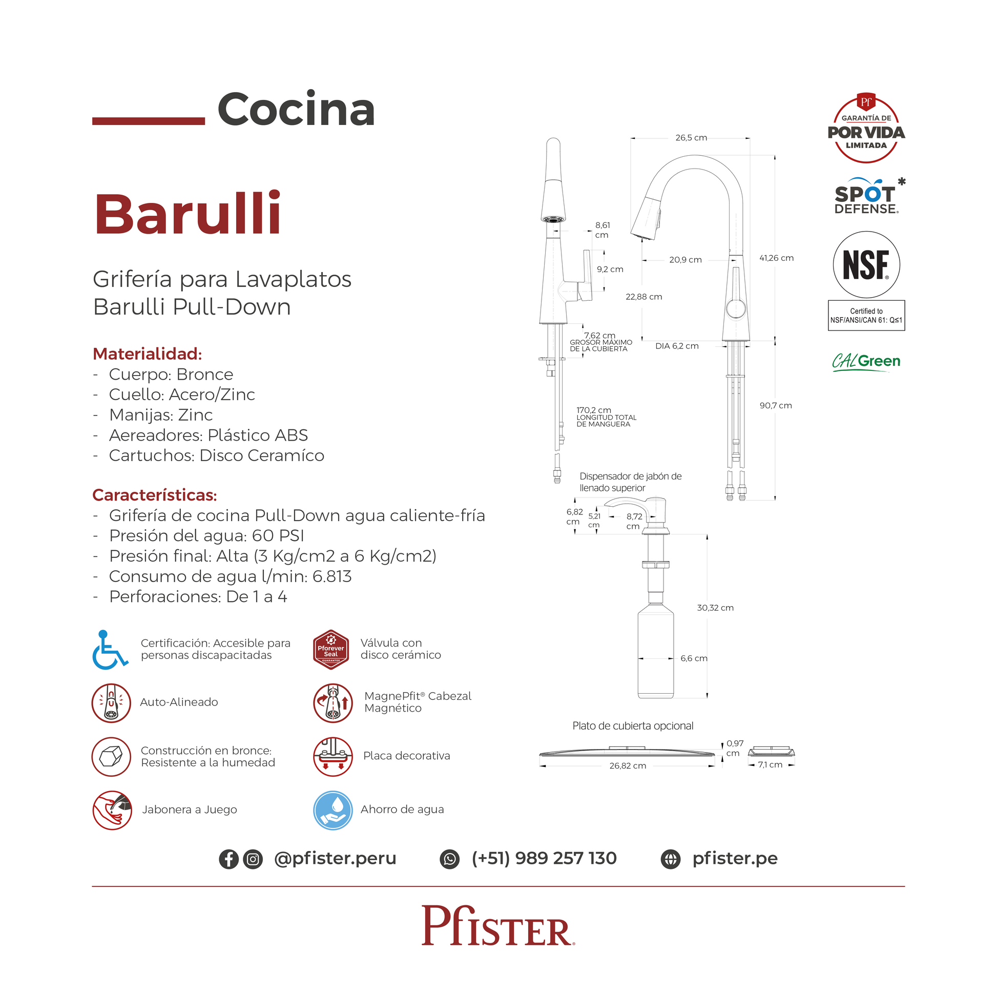 - Cabezal: Pull-down (Manguera flexible que se puede jalar hacia abajo. Esto te permite dirigir el agua con más facilidad para lavar o limpiar. Al soltarlo, el cabezal vuelve a su lugar automáticamente