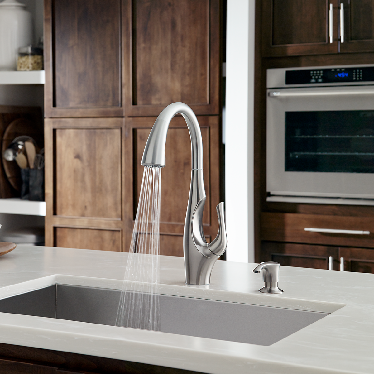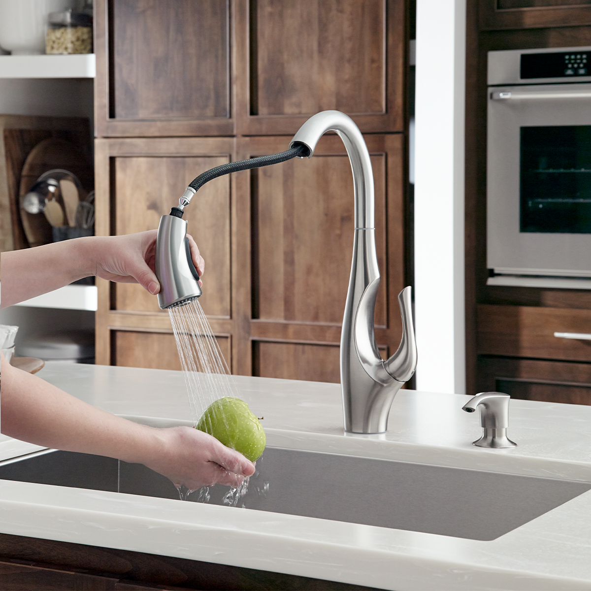 - Cabezal: Pull-down (Manguera flexible que se puede jalar hacia abajo. Esto te permite dirigir el agua con más facilidad para lavar o limpiar. Al soltarlo, el cabezal vuelve a su lugar automáticamente