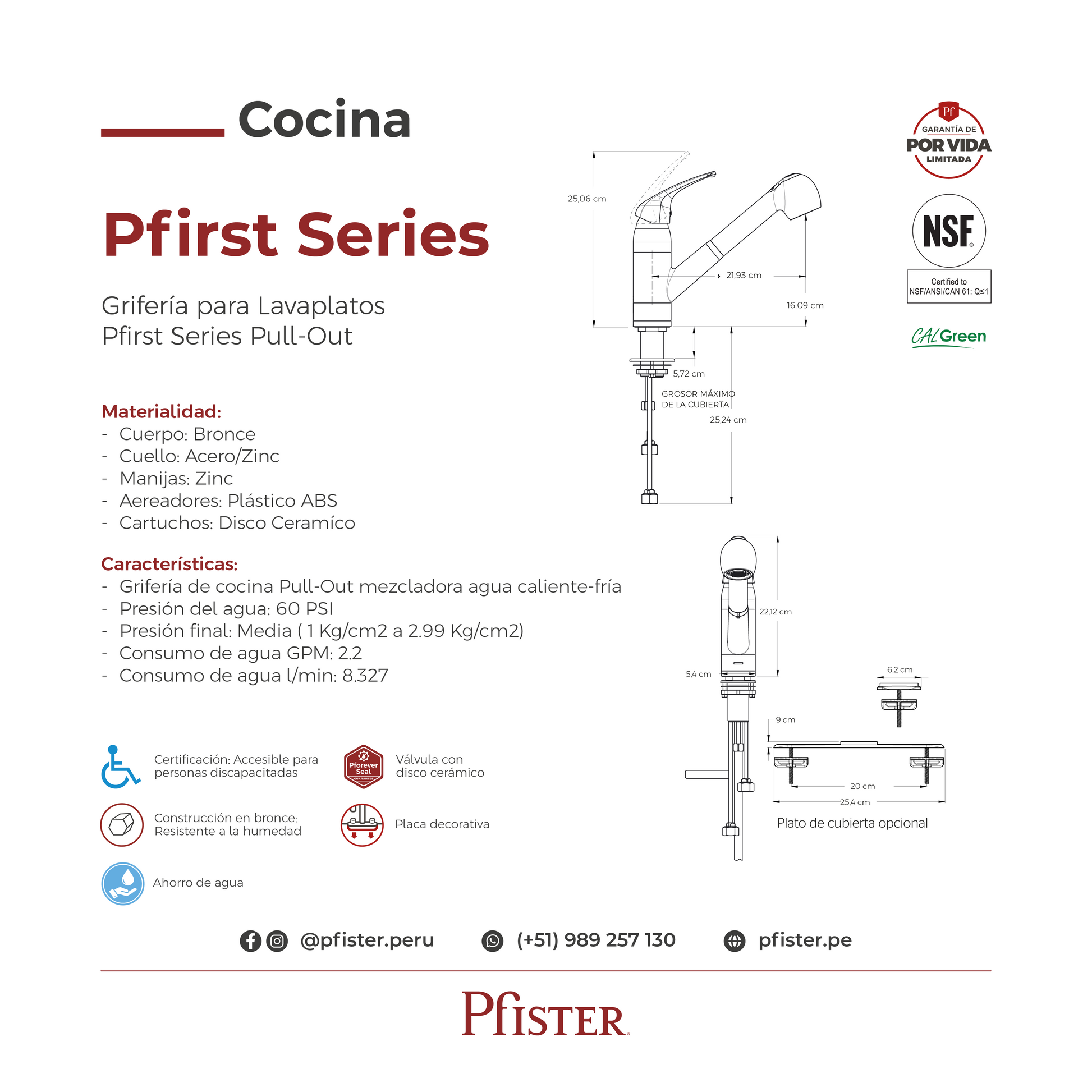 - Cartuchos: Disco Cerámico (Asegura el flujo constante y sin goteo)
