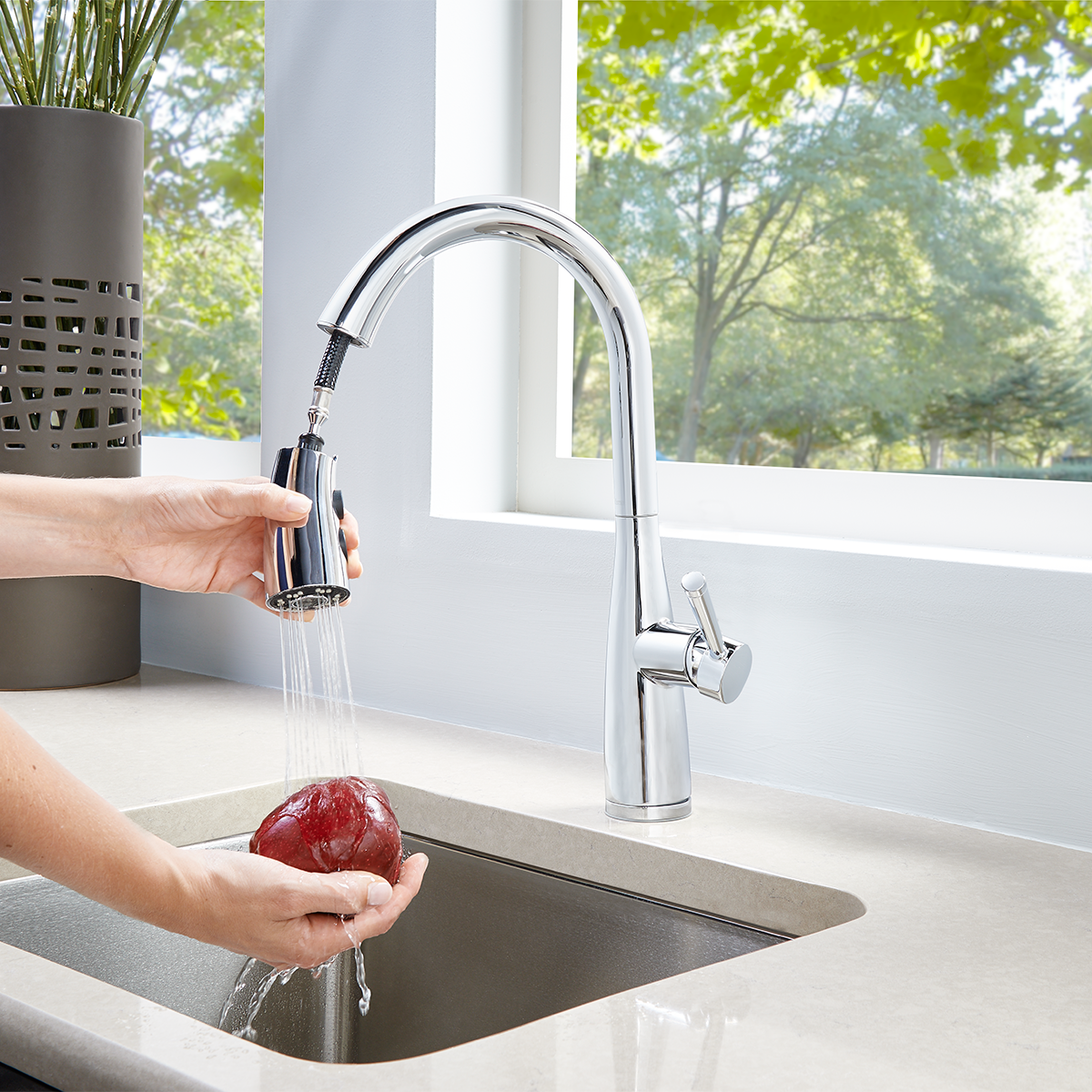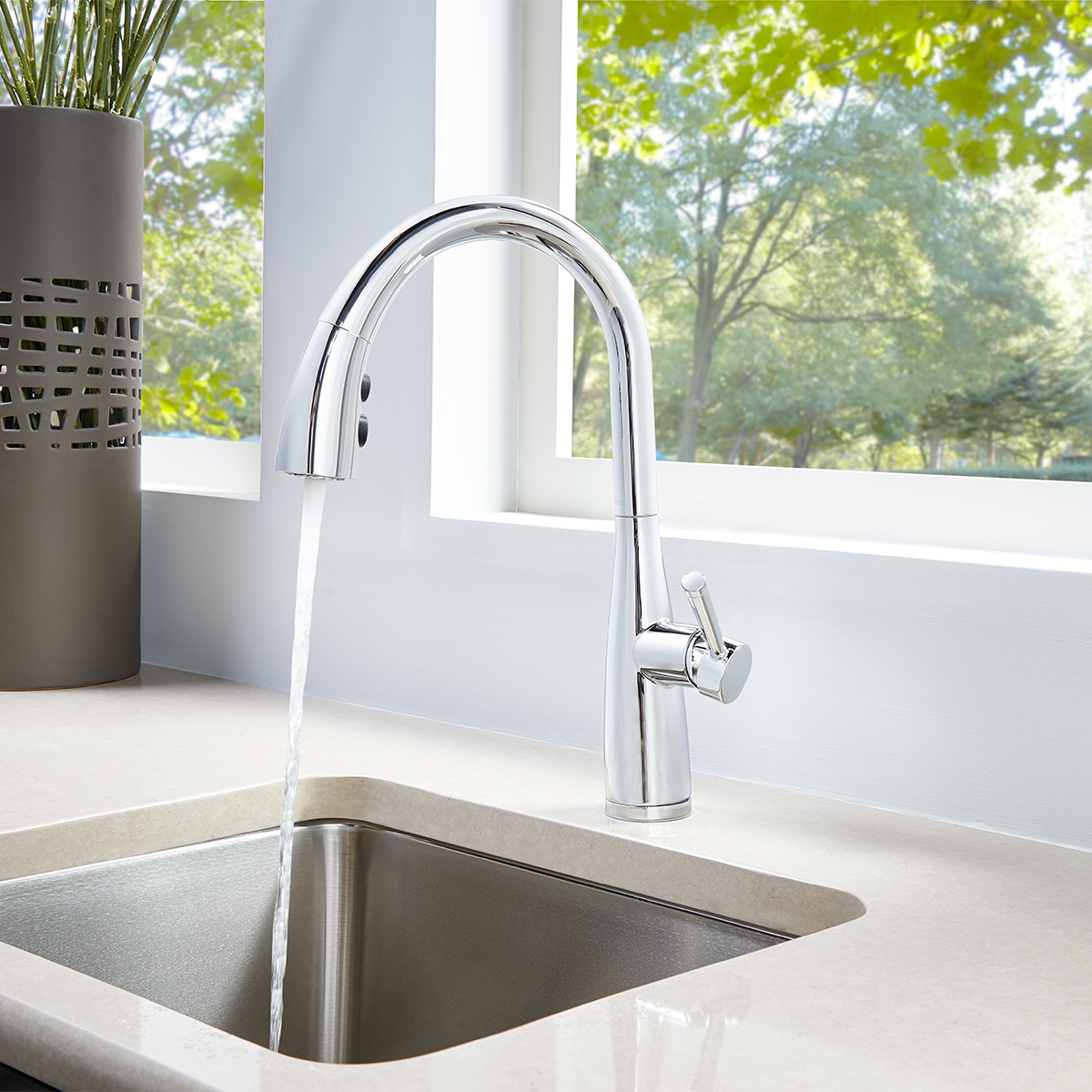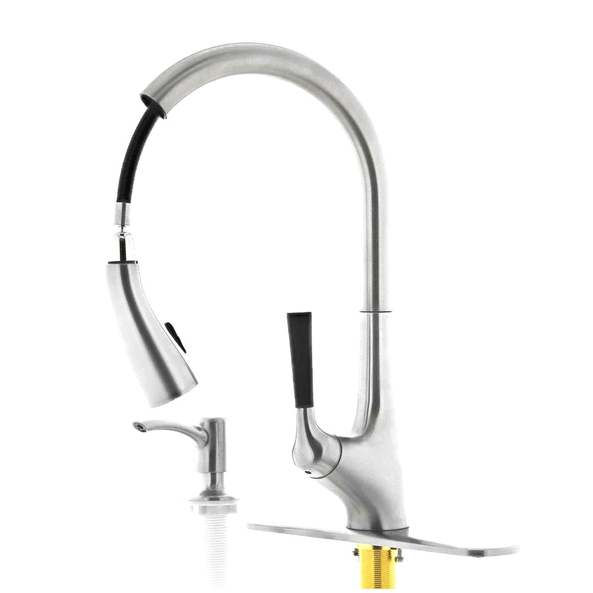 - Cabezal: Pull-down (Manguera flexible que se puede jalar hacia abajo. Esto te permite dirigir el agua con más facilidad para lavar o limpiar. Al soltarlo, el cabezal vuelve a su lugar automáticamente