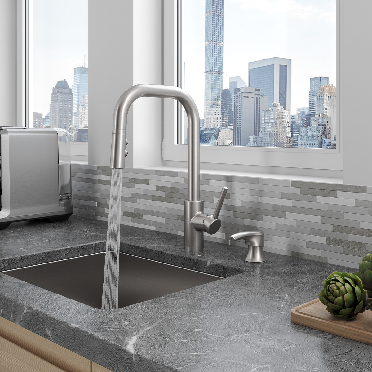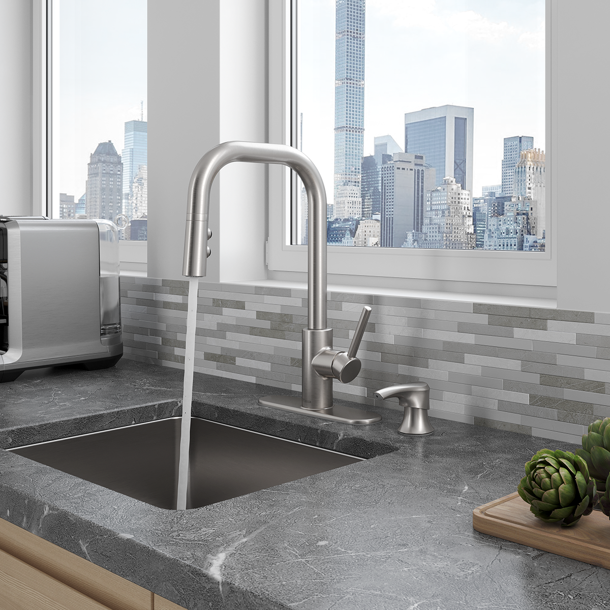 - Cabezal: Pull-down (Manguera flexible que se puede jalar hacia abajo. Esto te permite dirigir el agua con más facilidad para lavar o limpiar. Al soltarlo, el cabezal vuelve a su lugar automáticamente